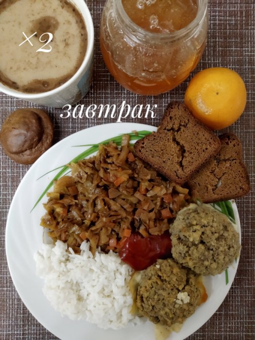 Завтрак: рыбные котлеты, отварной рис, тушеная капуста, кетчуп, хлеб, мандарин, кекс с арахисовой пастой, кофе с молоком и медом.