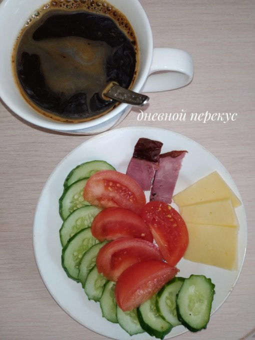 Дневной перекус: ветчина, сыр, огурец, помидор, черный кофе.