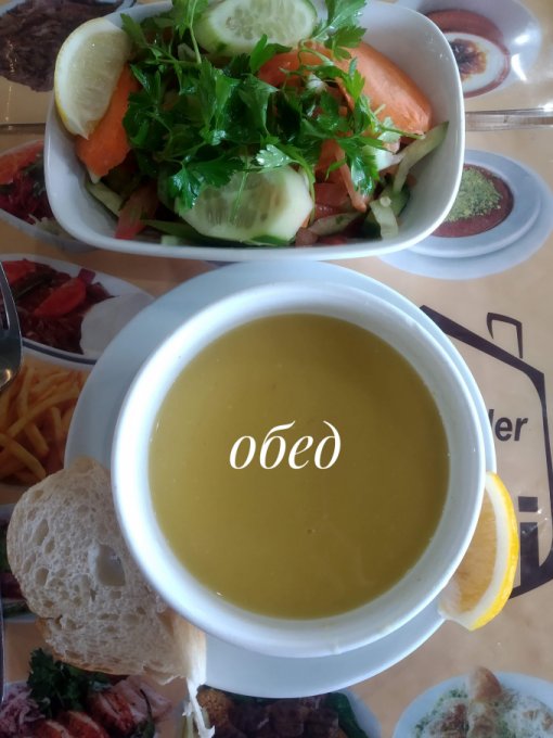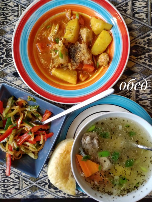Обед: суп "Шорпо", лепешка, овощной салат, рагу из курицы.
