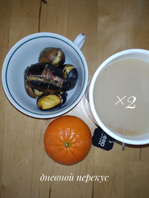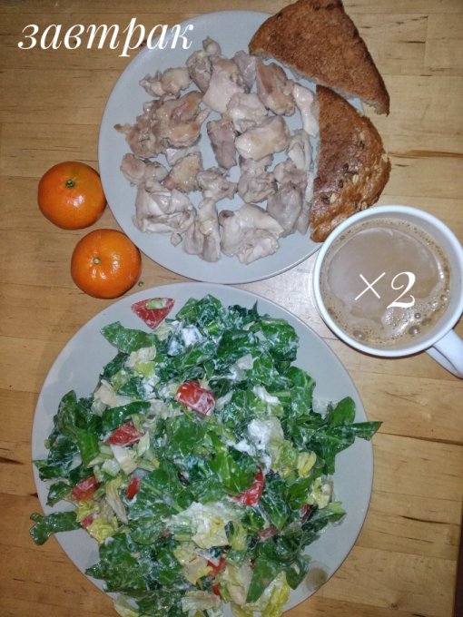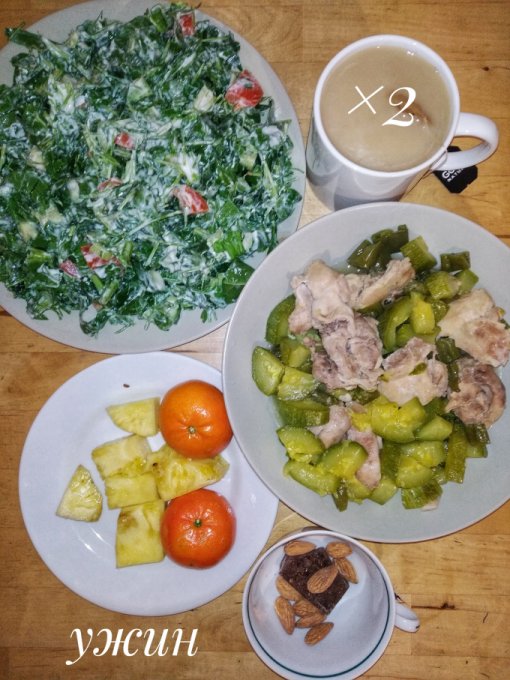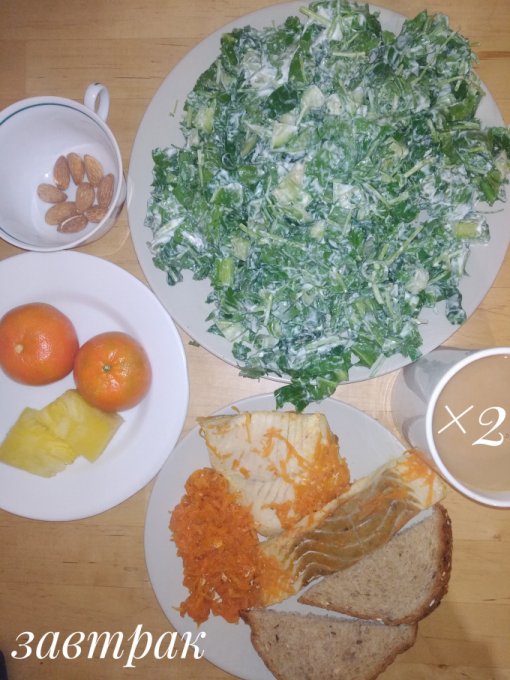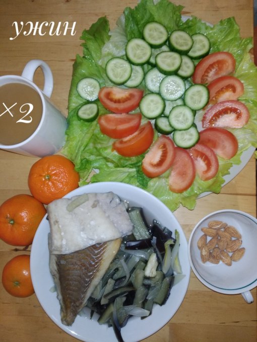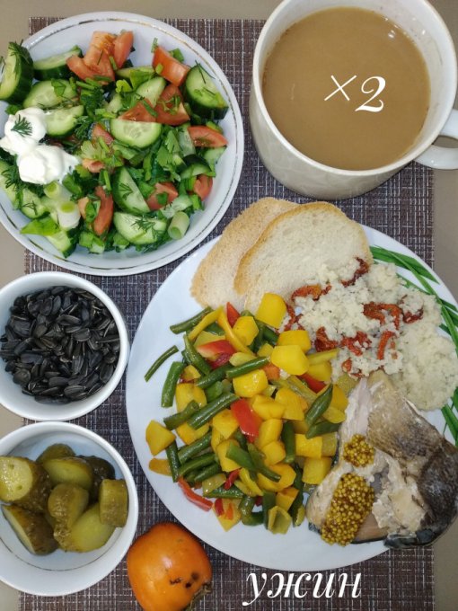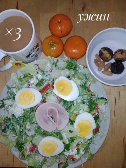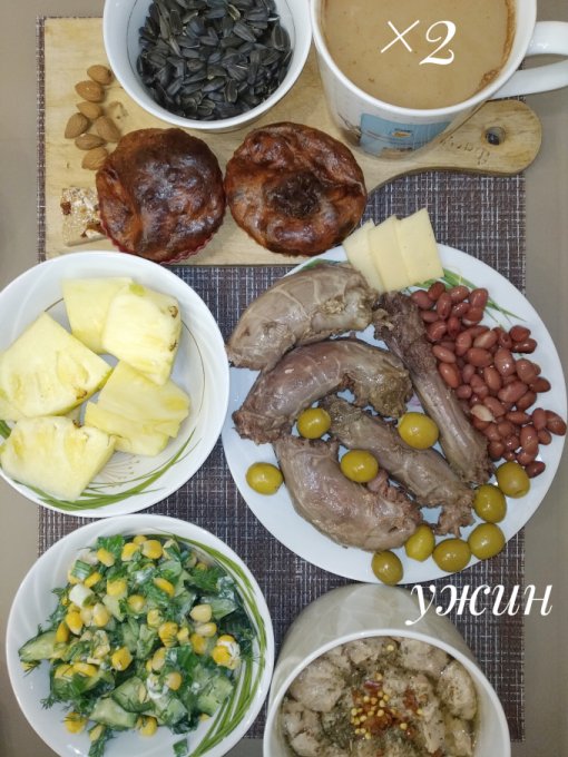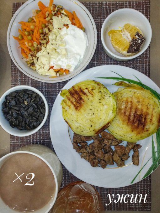 Ужин: печень куриная, капуста на гриле, салат (морковь, лук, горошек, адыгейский сыр, простокваша 3,5%, грецкий орех), апельсин, шоколад, семечки, кофе с медом и молоком.