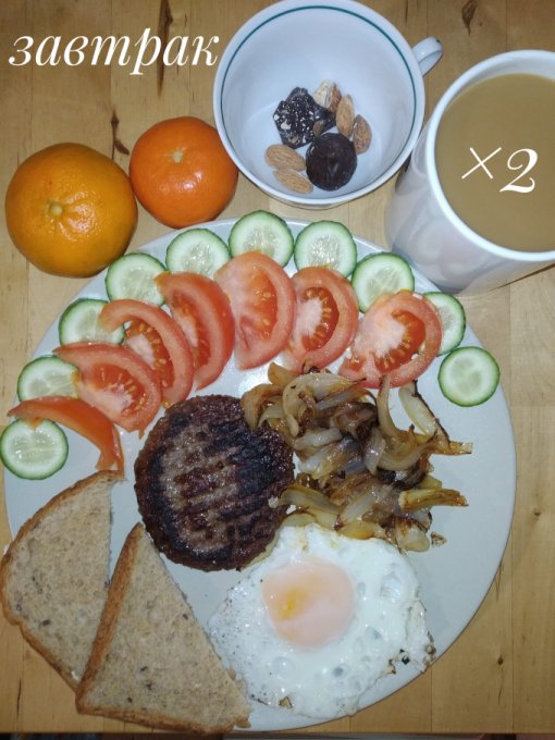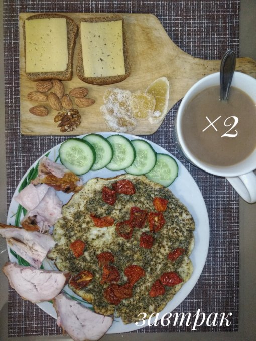 Завтрак: омлет с сушеными томатами и специями, копченая куриная грудка, огурец, хлеб с сыром, орехи, имбирь в сахаре, кофе с молоком.