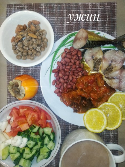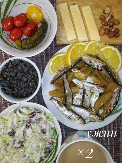 Ужин: килька запеченная с луком, лимон, салат (капуста, лук, фасоль, копченая курица, простокваша 3,5%), сыр, орехи, соленья, семечки, чай с молоком.