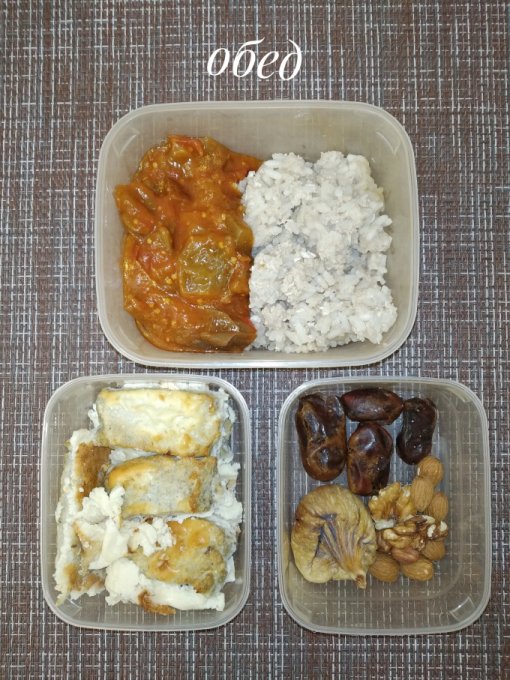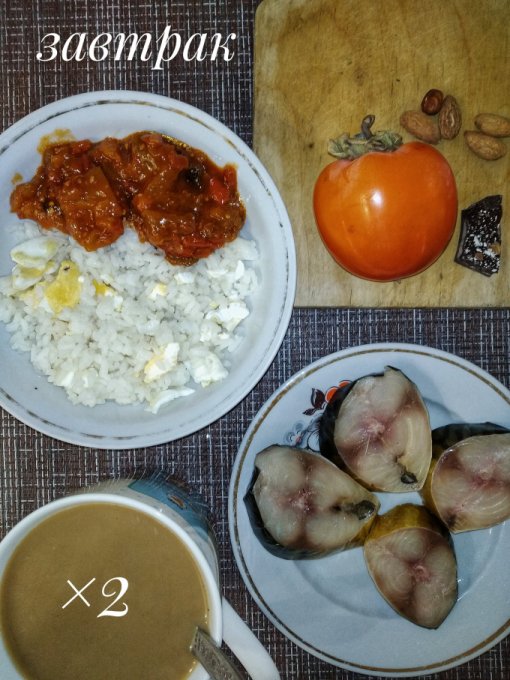 Завтрак: рис с яйцом, баклажаны с овощами, скумбрия х/к, хурма, шоколад, орехи, кофе с молоком.