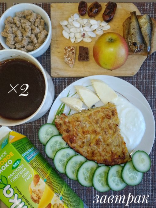 Завтрак: запеканка (картошка, фарш, сыр, яйцо), простокваша 3,5%, адыгейский сыр, огурец, бутерброд со шпротами, яблоко, финики, тыквенные семечки, шоколад, пшеничные отруби, кофе с банановым молоком.