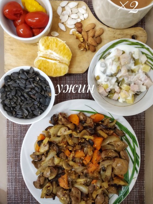 Ужин: куриная печень с шампиньонами и овощами, оливье, соленья, тыквенные семечки, орехи, семечки, апельсин, чай с молоком.
