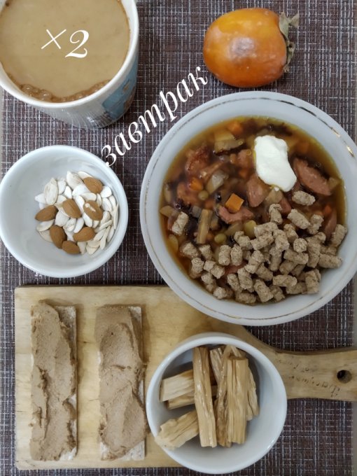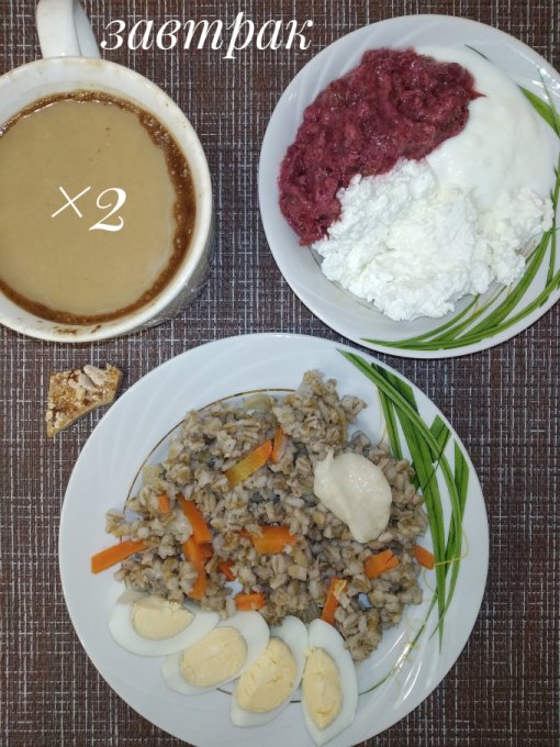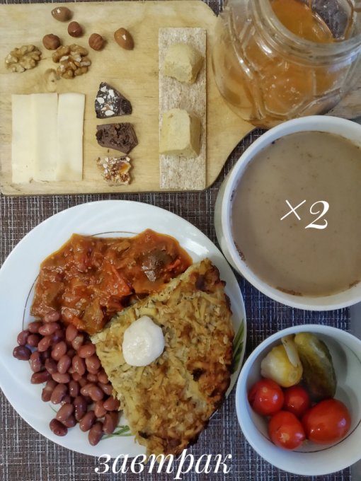 Завтрак: запеканка (картошка, фарш, сыр, яйцо), хрен столовый, фасоль консервированная, баклажаны с овощами, соленья, хлебец с печенью трески, сыр, шоколад, орехи, кофе с медом и молоком.