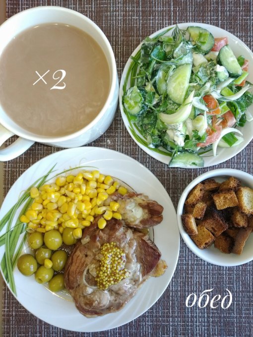 Обед: голень индейки, зернистая горчица, оливки, кукуруза, салат со сметаной 30%, сухарики, чай с молоком.