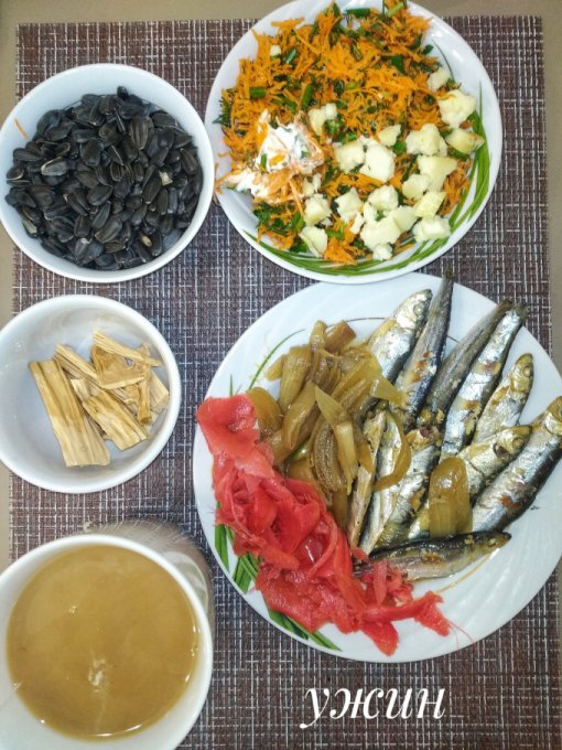 Ужин: килька запеченная с луком, маринованный имбирь, соевая спаржа, салат с адыгейским сыром и сметаной, семечки, чай с молоком.