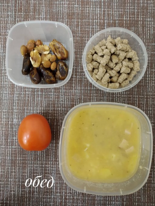 Обед: гороховый суп с копченой курицей, ржаные отруби, яблоко, апельсин.
