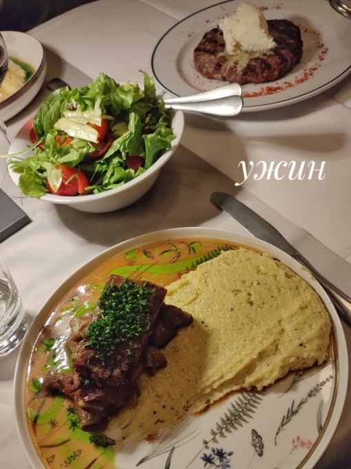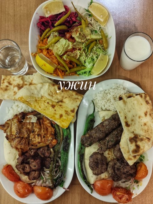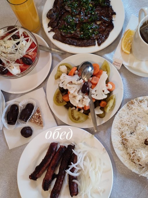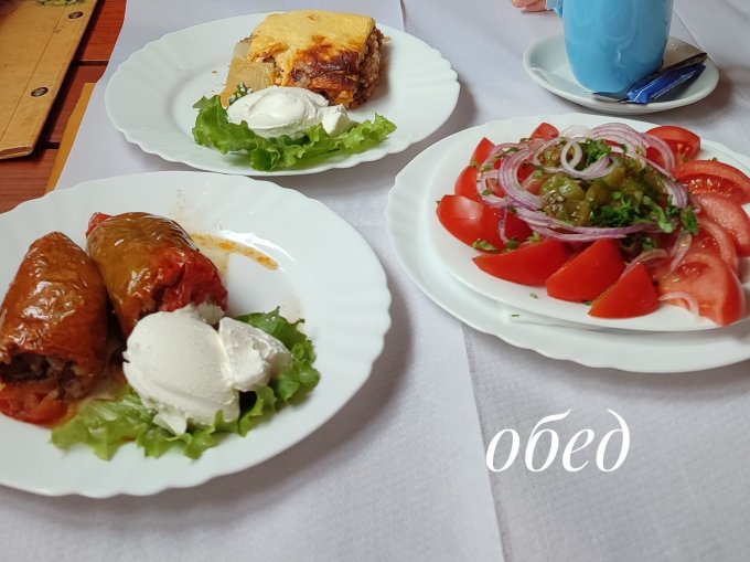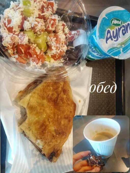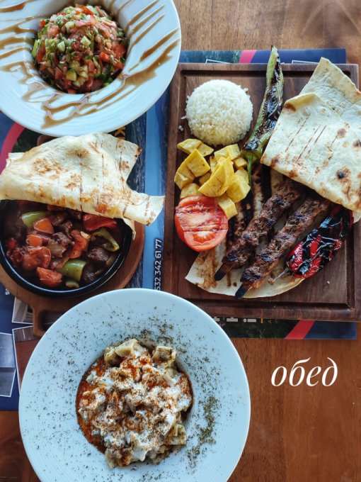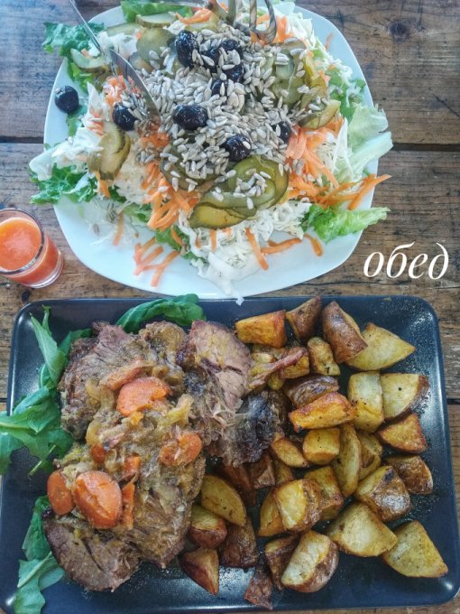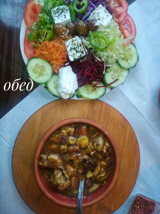 Обед не все мне) Только левый верхний угол: жаркое с лепешкой и салат.