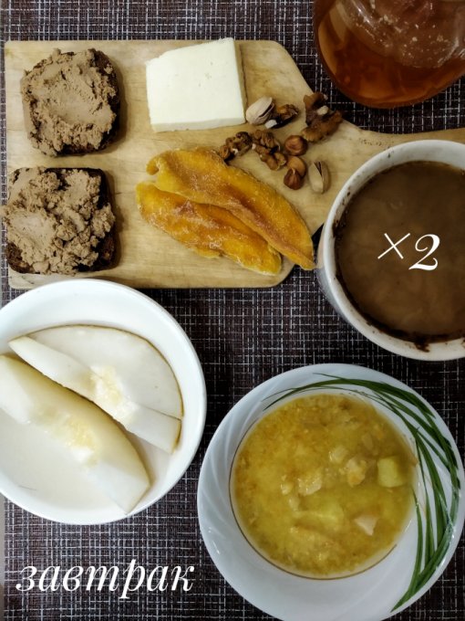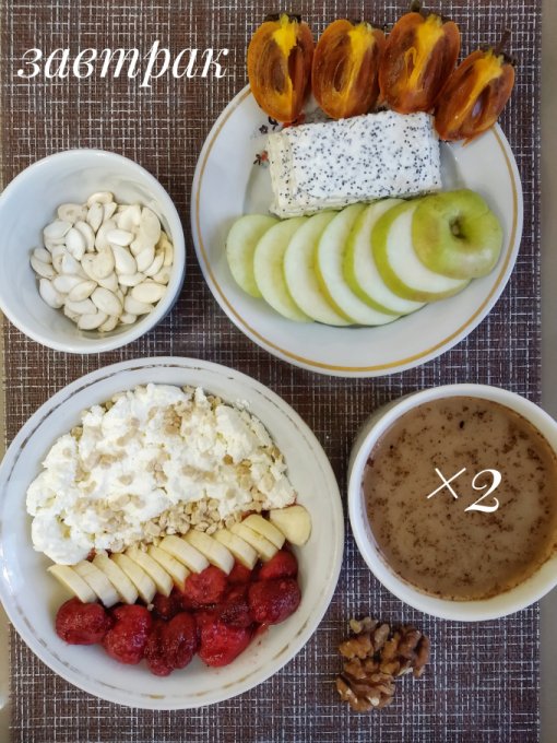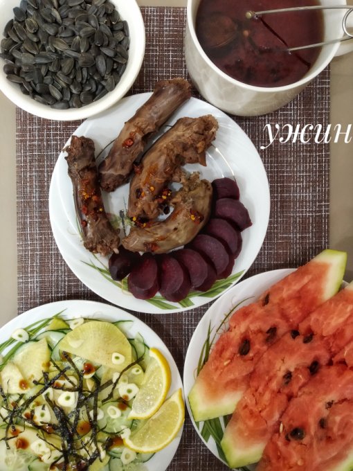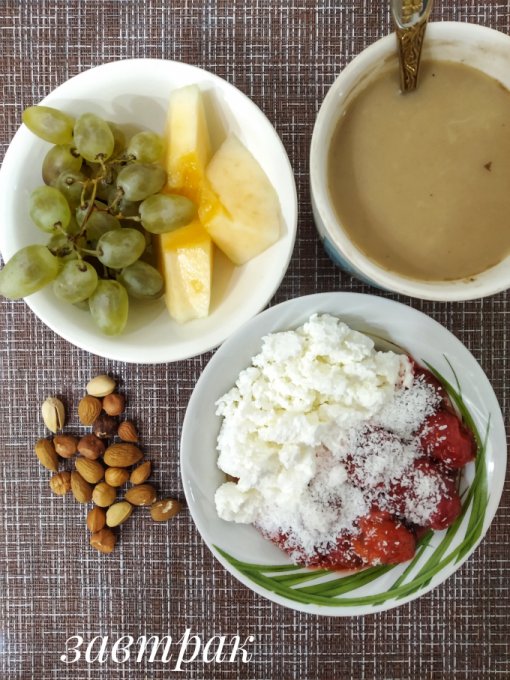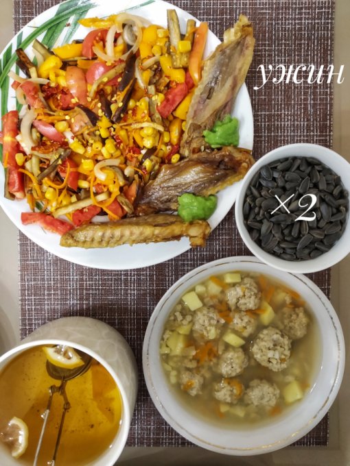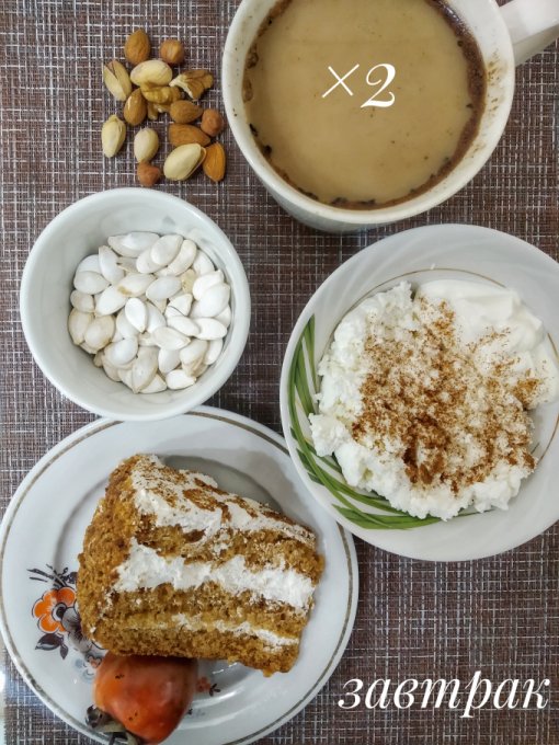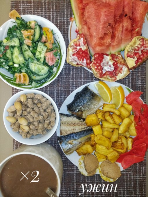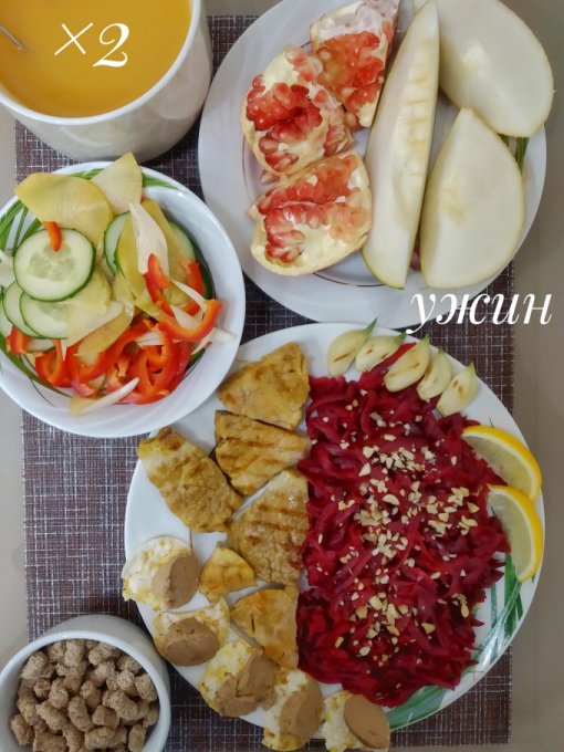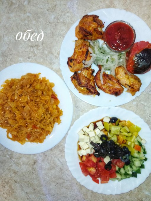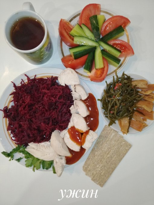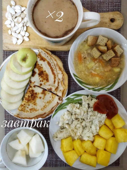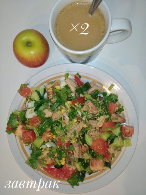 оладьи, гречка со сливочным маслом, хрен столовый, овощной салат🥬 с