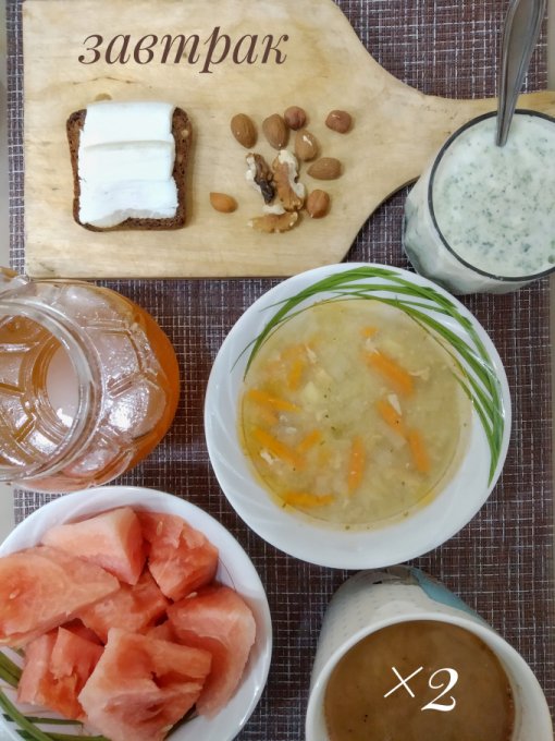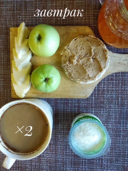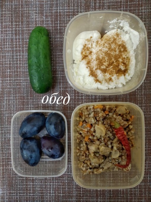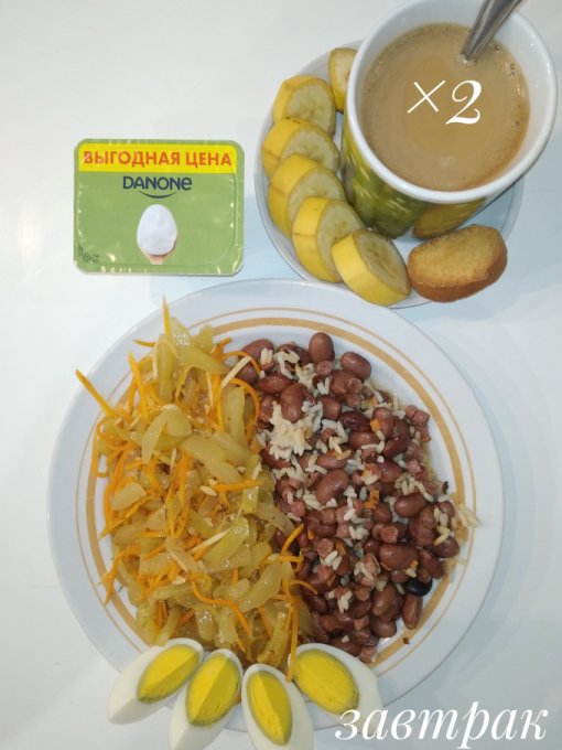 сырокопчеными колбасками, яйцо, огурец по-корейски, йогурт, банан🍌,