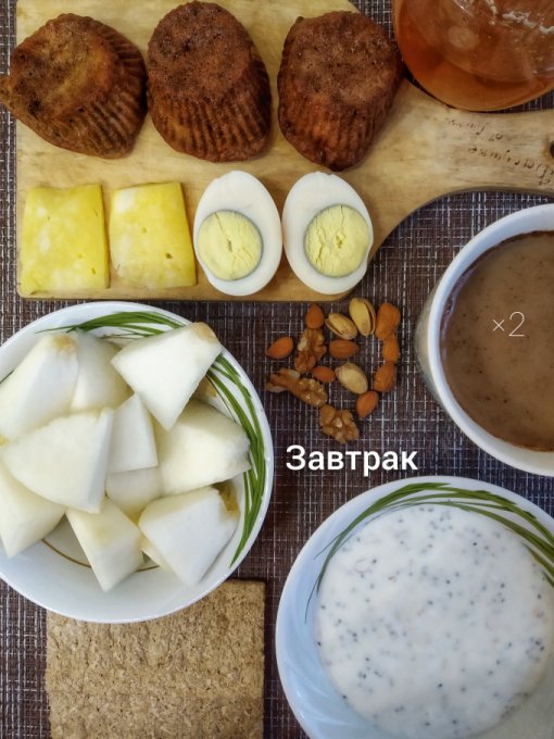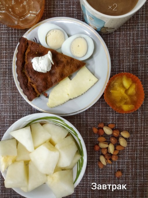 Завтрак: ленивая овсянка (геркулес, семена чиа, соевый протеин, кефир 3,2%), яйцо, творожные кексы, хлебцы, домашний сыр, орехи, дыня, кофе с медом и молоком.