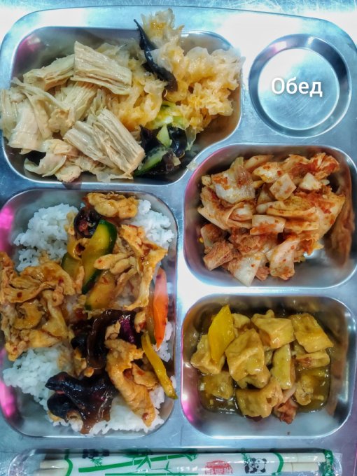 Обед: рис, курица с овощами, жареный тофу в кислом соусе, кимчи, соевая спаржа, гребешки с грибами.