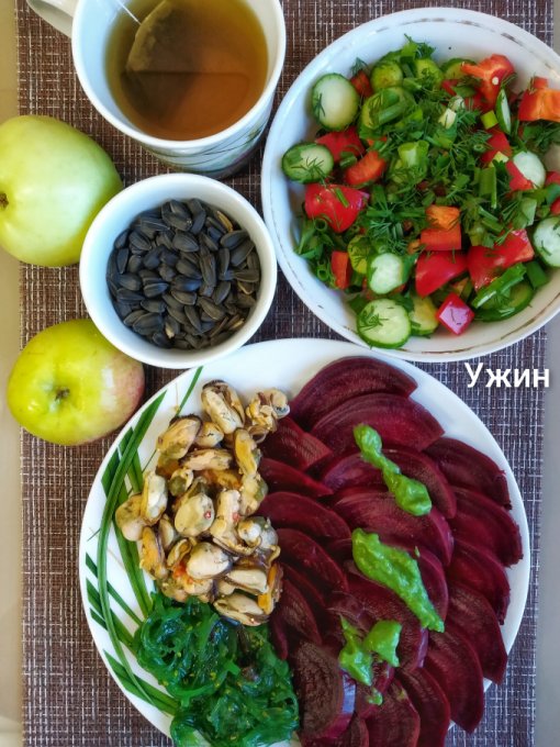 Ужин: мидии в масле, чука, свекла запечённая, васаби, овощной салат с маслом виноградной косточки, яблоки, семечки, чай.