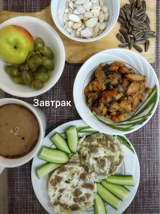 Завтрак: омлет в микроволновке (2 белка, 1 яйцо, хлеб, сметана 20%), овощное рагу с сардельками, тыквенные семечки, семечки со вкусом шоколада, виноград, яблоко🍏, кофе с молоком.
