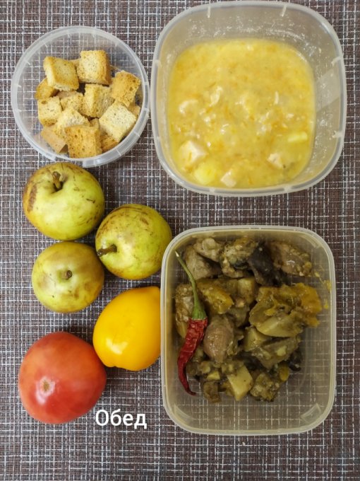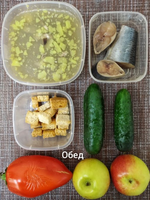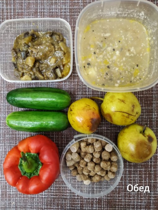 Обед: рыбный суп, отруби, свинина с овощами, огурцы, перец, груши.