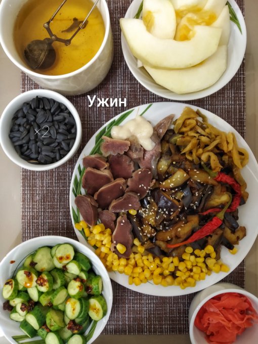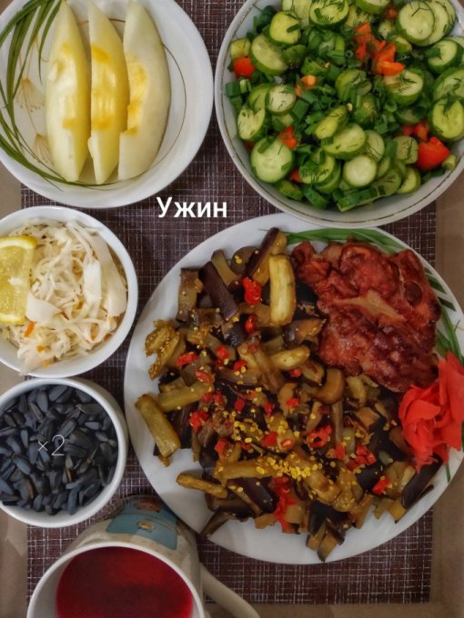 Ужин: свинина на гриле, жареные баклажаны🍆, перец чили, маринованный имбирь, квашеная капуста, овощной салат с маслом, дыня, семечки, чай.