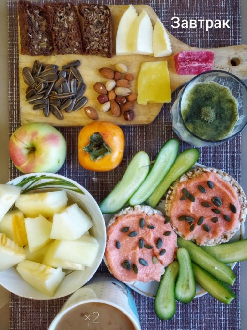 Завтрак: хлебцы с икрой минтая и тыквенными семечками, огурцы, творожно-овсяная запеканка🥧, адыгейский сыр, домашний сыр, орехи, семечки со вкусом шоколада, кефир 3,2% с порошком сныти, сушеная папайя, хурма, яблоко, дыня, кофе с молоком.