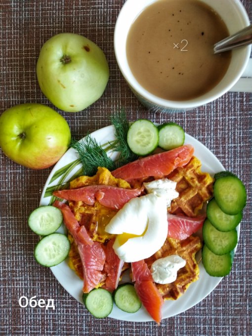 Обед: тыквенные вафли🧇 с форелью, творожным сыром и яйцом пашот, яблоки, кофе с молоком.