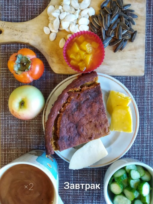 Завтрак: тыквенная запеканка, огурцы, домашний сыр, адыгейский сыр, тыквенные семечки, "шоколадные" семечки, яблоко, хурма, манговое желе🥭, кофе с молоком.