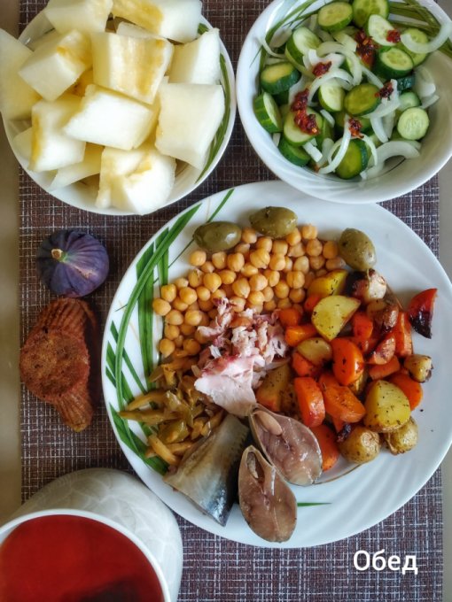 Обед: сельдь с/с🎣, копченая куриная грудка, отварной нут, маринованный папоротник, запечённые овощи, оливки, огурцы с острым соусом, дыня, инжир, творожный кекс, чай.