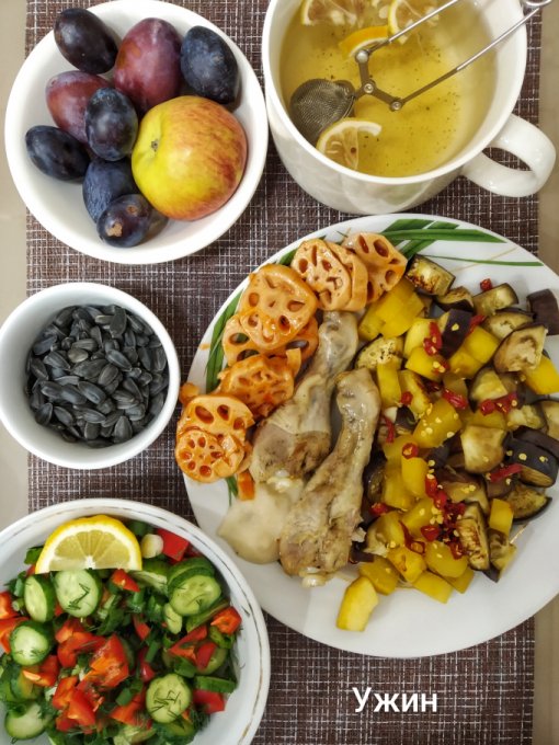 Ужин: куриные голени🍗, жареные овощи с перцем чили, маринованный корень лотоса, овощной салат с маслом, сливы, яблоко, семечки, чай.