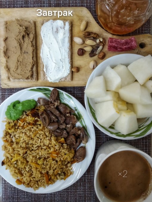Завтрак: куриные сердечки, жареный рис с яйцом, васаби, хлебцы с творожным сыром и домашним паштетом, орехи🌰, сушеная папайя, дыня, кофе с молоком и медом.