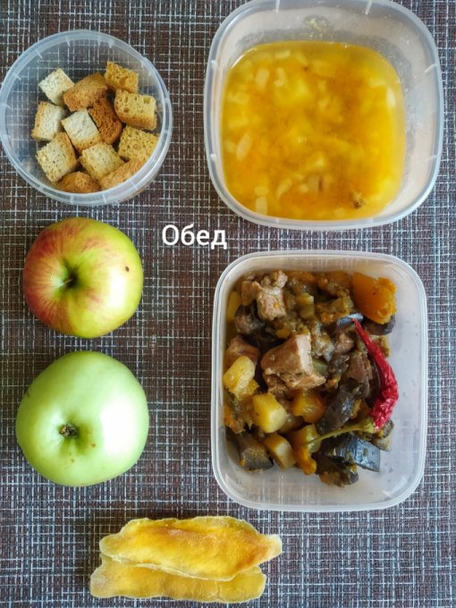 Обед: гороховый суп с копченой курицей, сухари, свинина с овощами, яблоки, манго сушеное🥭.
