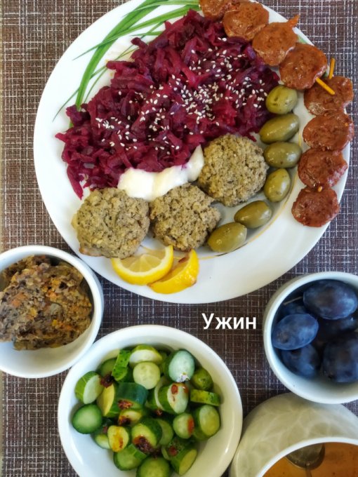 Ужин: рыбные котлеты, хрен столовый, острые "шашлычки" из тофу🍢, запеченная свекла с маслом и кунжутом, оливки, лимон, грибная икра, огурцы с острым соусом, сливы, чай.