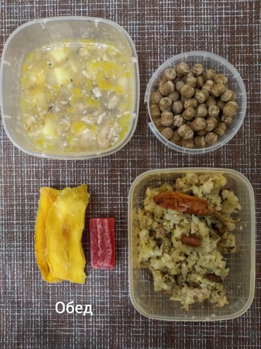 Обед: суп с рыбными консервами, ржаные отруби, тушеная капуста с фаршем и фасолью, сушеное манго🥭, папайя.