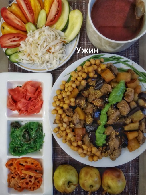Ужин: соевое мясо с овощами, васаби, отварной нут, маринованный корень лотоса💮, чука, маринованный имбирь, квашеная капуста, помидоры, огурцы, груши, чай.