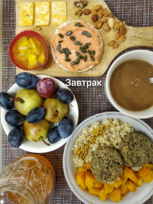 Завтрак: рыбные котлеты, булгур, запеченная тыква, зернистая горчица, сыр, хлебец с икрой минтая и тыквенными семечками, манговое желе, груши, сливы, кофе с молоком и медом.