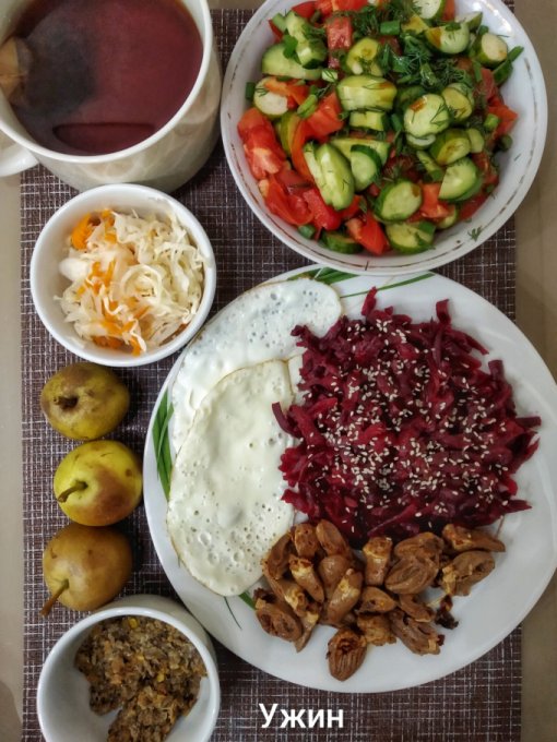 Ужин: куриные сердечки в остром соусе, 2 куриных белка, запеченная свекла с кунжутом, овощной салат с устричным соусом, квашеная капуста, грибная икра, груши, чай.