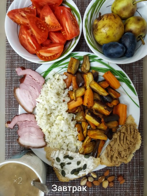 Завтрак: копченая грудинка, рис с яйцом, запеченные овощи с острым соусом, бутерброды с паштетом и творожным сыром), помидоры, орехи, груши, сливы, кофе с молоком.