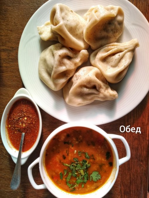 Обед: харчо, хинкали с говядиной и бараниной, сацебели.