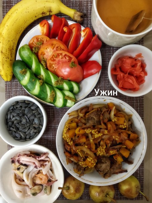 Ужин: говяжье легкое жареной с тыквой и луком, зернистая горчица, овощи с соусом "Песто", морепродукты, маринованный имбирь, банан, груши, семечки, чай.