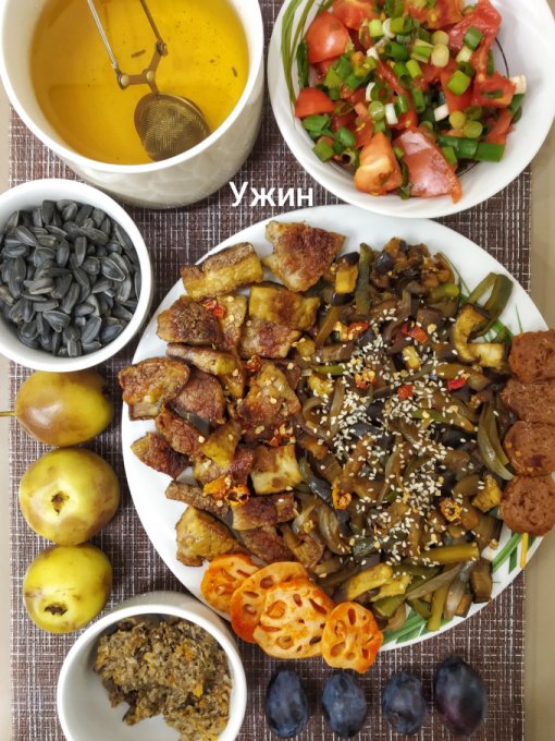Ужин: жареное говяжье вымя*, овощи в соевом соусе (баклажаны, огурцы, лук), кунжут, "шашлычки" из тофу, маринованный корень лотоса, овощной салат с маслом, грибная икра, сливы, груши, семечки, чай.