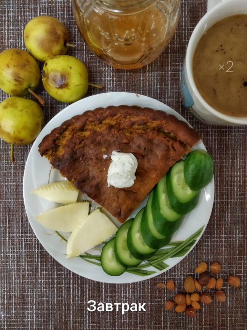 Завтрак: творожная запеканка, творожный сыр, адыгейский сыр, огурец, груши, орехи, кофе с молоком и медом.