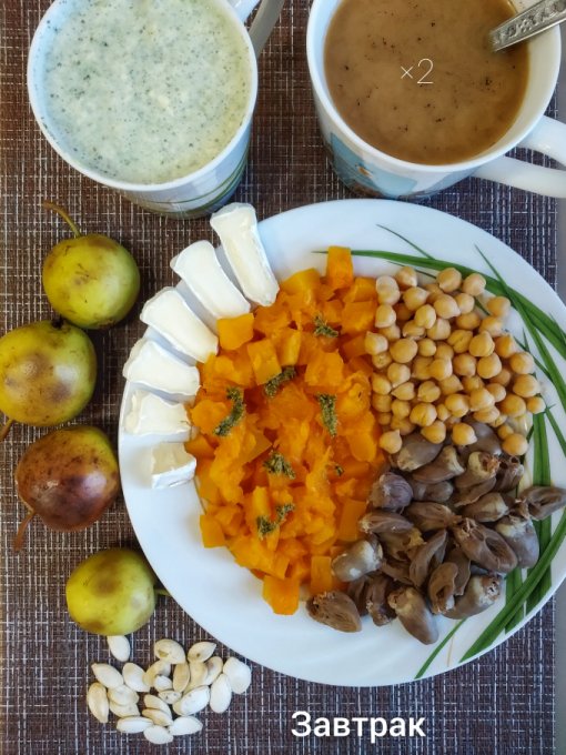 Завтрак: куриные сердечки, отварной нут, запеченная тыква, соус "Песто", сыр бри, тыквенные семечки, смузи (кефир 0%, соевый протеин, шпинат, порошок сныти), груши, кофе с молоком.