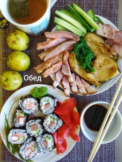 Обед: суши, маринованный имбирь, васаби, соевый соус, жареная зубатка, копченая горбуша, огурец, салат чука, копченая свинина, груши, чай.