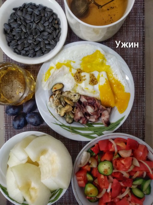Ужин: яичница (1 яйцо, 1 белок), зернистая горчица, морепродукты в масле, овощной салат с устричным соусом, сливы, дыня, пиво, семечки, чай.