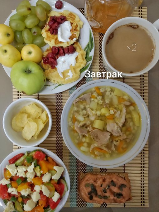 Завтрак: куриный суп со звездочками, салат с адыгейским сыром и маслом виноградной косточки, бутерброд с икрой минтая и тыквенными семечками, чипсы, творожные вафли со сметаной и вишней в с/с, фрукты, кофе с медом и молоком.