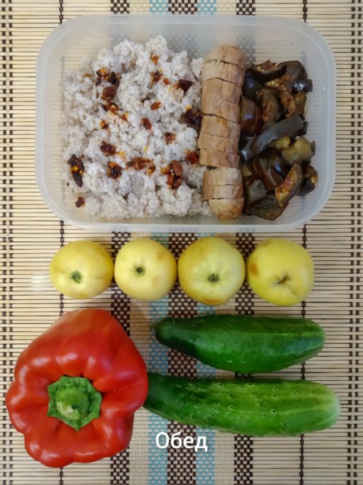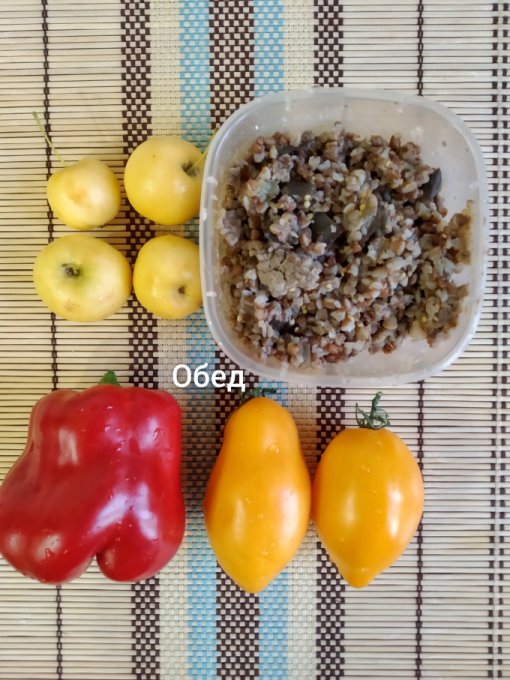 Обед: гречка с фаршем и баклажанами, перец, помидоры, яблоки.