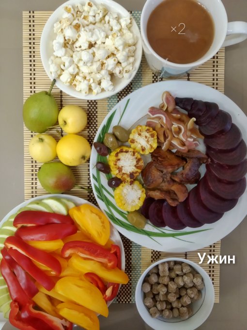 Ужин: жареная куриная печень, копченые свиные уши, запеченная свекла, кукуруза на гриле, оливки, овощная нарезка (помидор, перец, кабачок), соленый попкорн, ржаные отруби, груши, яблоки, чай с молоком.