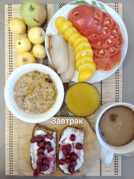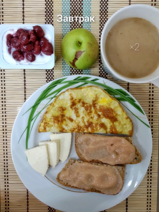 Завтрак: омлет (1 яйцо+1 белок, молоко), адыгейский сыр, бутерброды с икрой минтая, йогурт с вишней в с/с, груша, кофе с молоком.