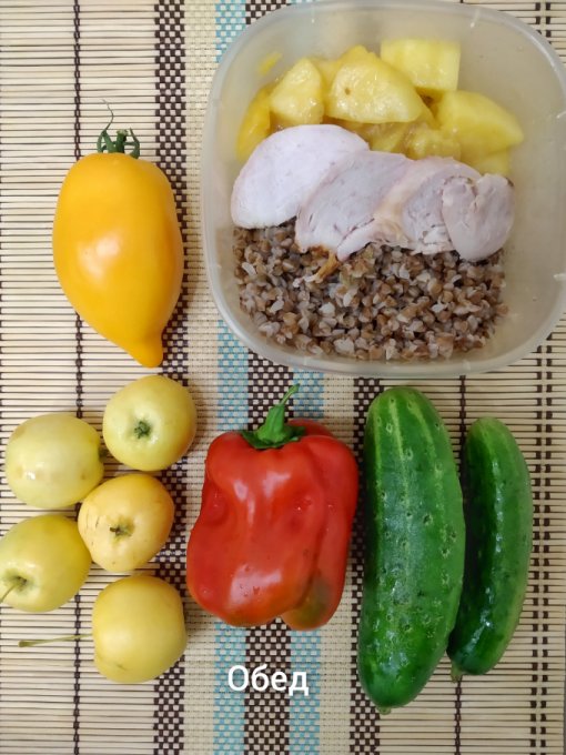 Обед: копченая куриная грудка, запеченная тыква, гречка, перец, огурцы, помидор, яблоки.