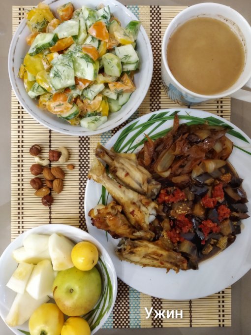 Ужин: запечённые куриные крылья, жареный баклажан, аджика, жареный лук (лук, кунжучное масло, икра минтая, соевый соус), овощной салат со сметаной, орехи, фрукты, кофе с молоком.