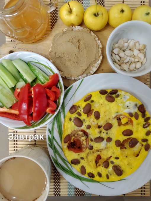 Завтрак: омлет (2 яйца, молоко, отварная фасоль, помидор), гречневый хлебец с домашним паштетом, тыквенные семечки, огурец, перец, яблоки, кофе с молоком и медом.