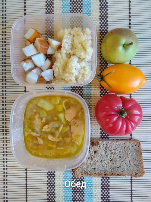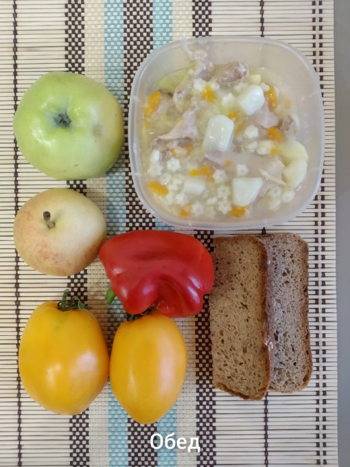 Обед: куриный суп со звездочками, хлеб, перец, помидоры, груша, яблоко.